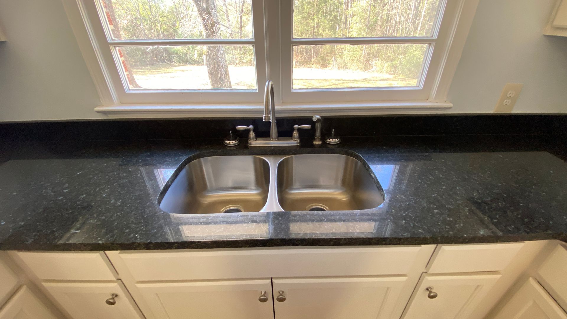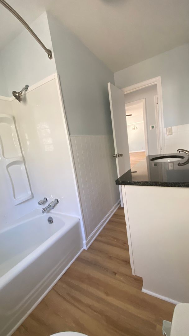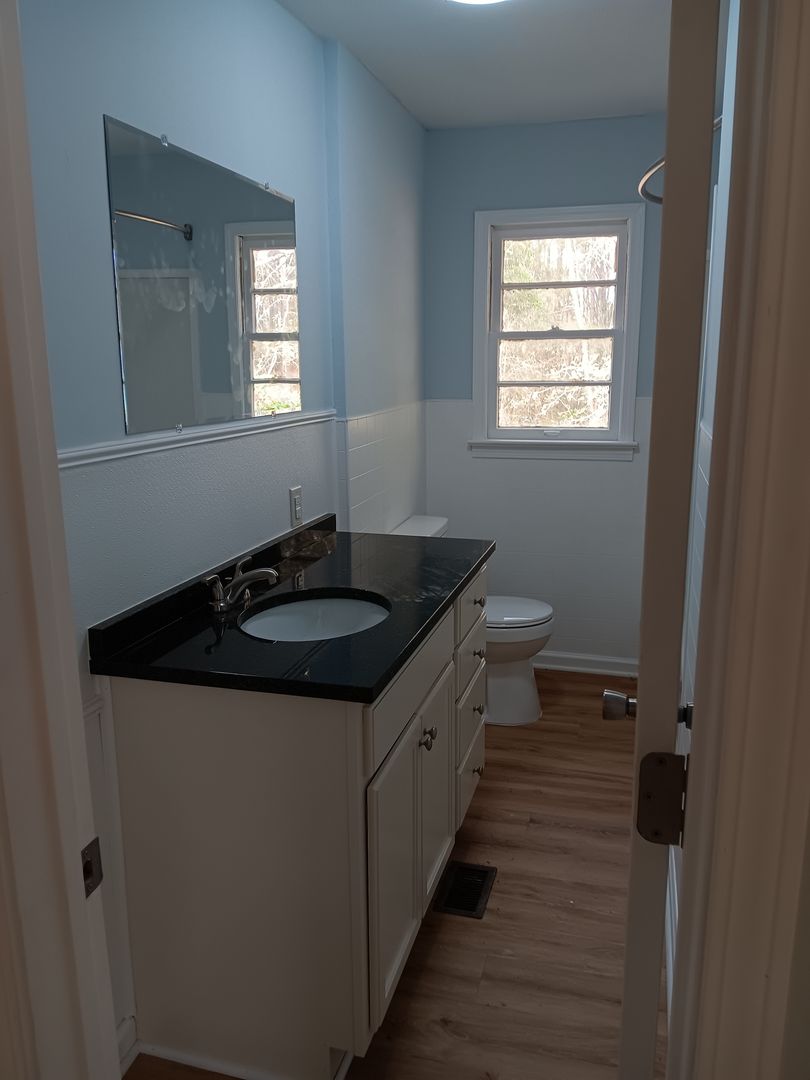 New countertop & vanity in bathroom. Outside storage with laundry room.