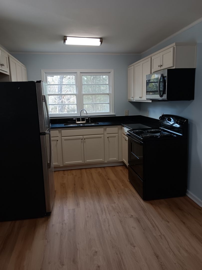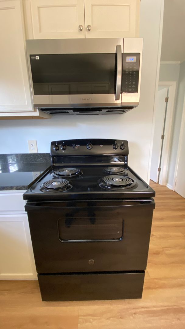 Kitchen has new cabinets, granite countertops, stove, and microwave.